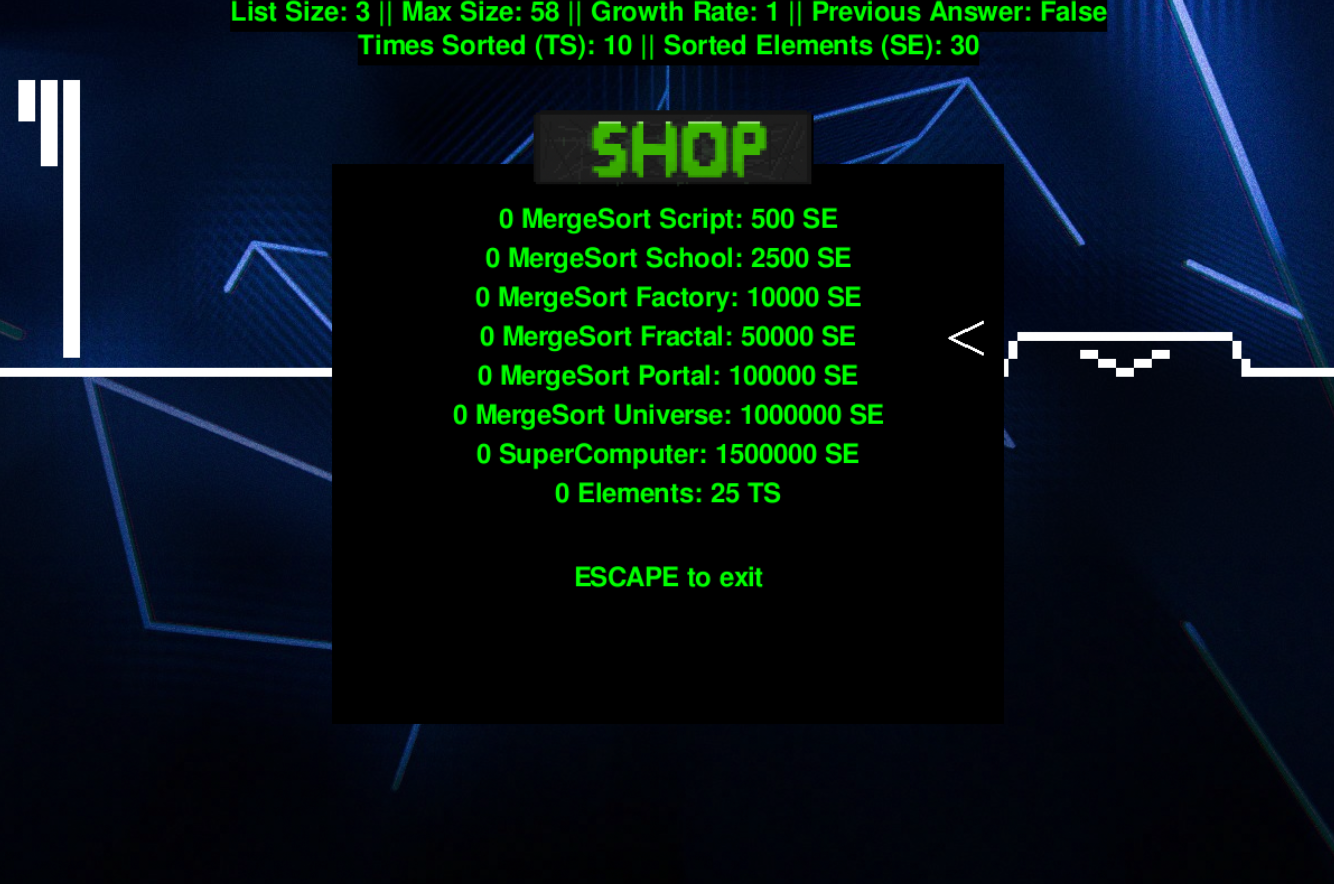 Inspired by cookie clicker, you are trapped beyond the edge of time with nothing but the knowledge of how to merge sort, which is definitely really useful and wont drive anyone to insanity. So to kill time, you spend your time sorting elements with merge sort since merge sort is the best sorting algorithm and its time complexity is O(nlogn) which is better than O(n^3) which is cool I think.